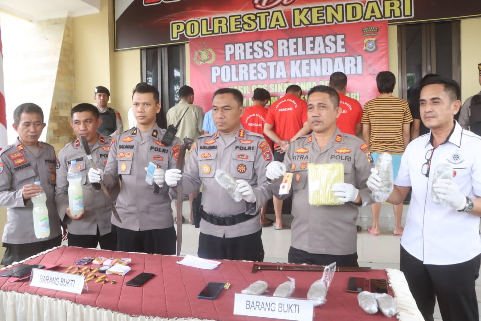 “Dari kasus itu barang bukti yang diamankan berupa 4 bilah senjata tajam, 1.032 gram ganja, 39,12 gram sabu-sabu, 186 liter miras dan dua unit sepeda motor. Dan semua barang bukti telah diamankan di Markas Polresta Kendari,” kata Fathurrahman saat rilis di Mapolresta Kendari, Rabu (23/8).