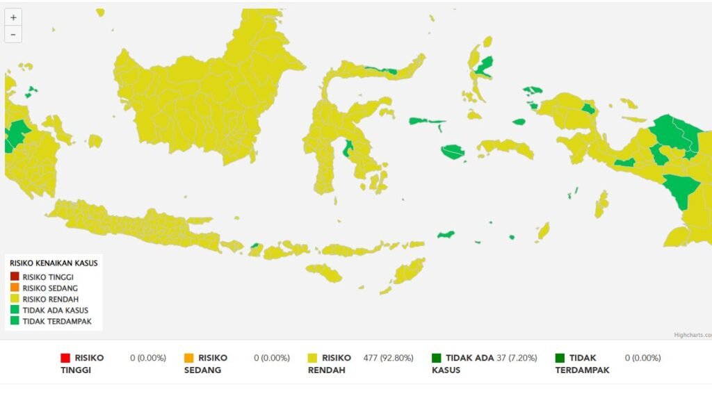 Sulawesi Tenggara – Satuan Tugas Penanganan Covid-19 di laman website resminya merilis perkembangan kasus Covid-19 di Republik Indonesia (RI). Tercatat sebanyak 37 kabupaten/kota dengan status zona hijau, persentase 7,20 persen.