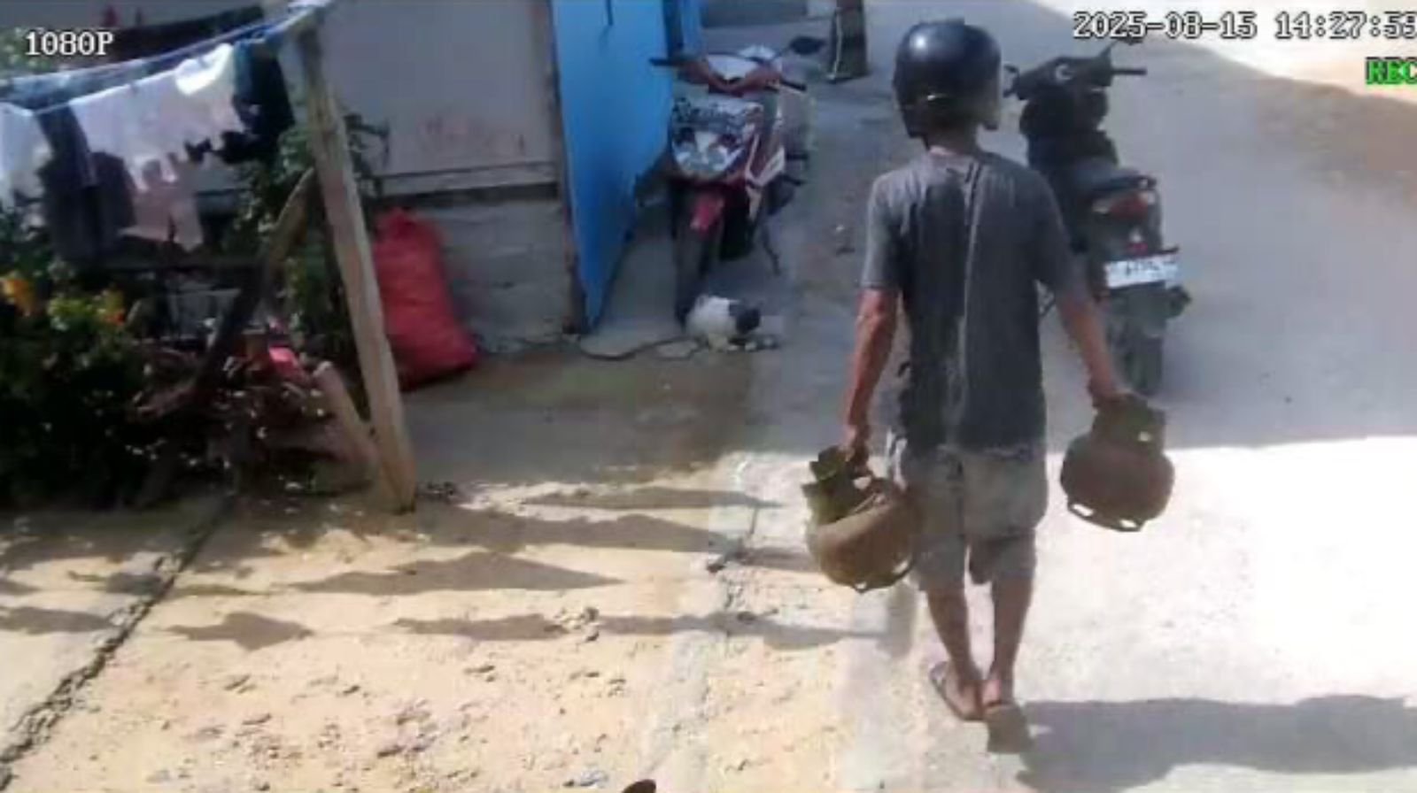 Selang beberapa saat, pelaku datang dengan membawa dan mengambil dua tabung gas yang tersimpan di pinggir jalan. Pelaku lalu melarikan diri.