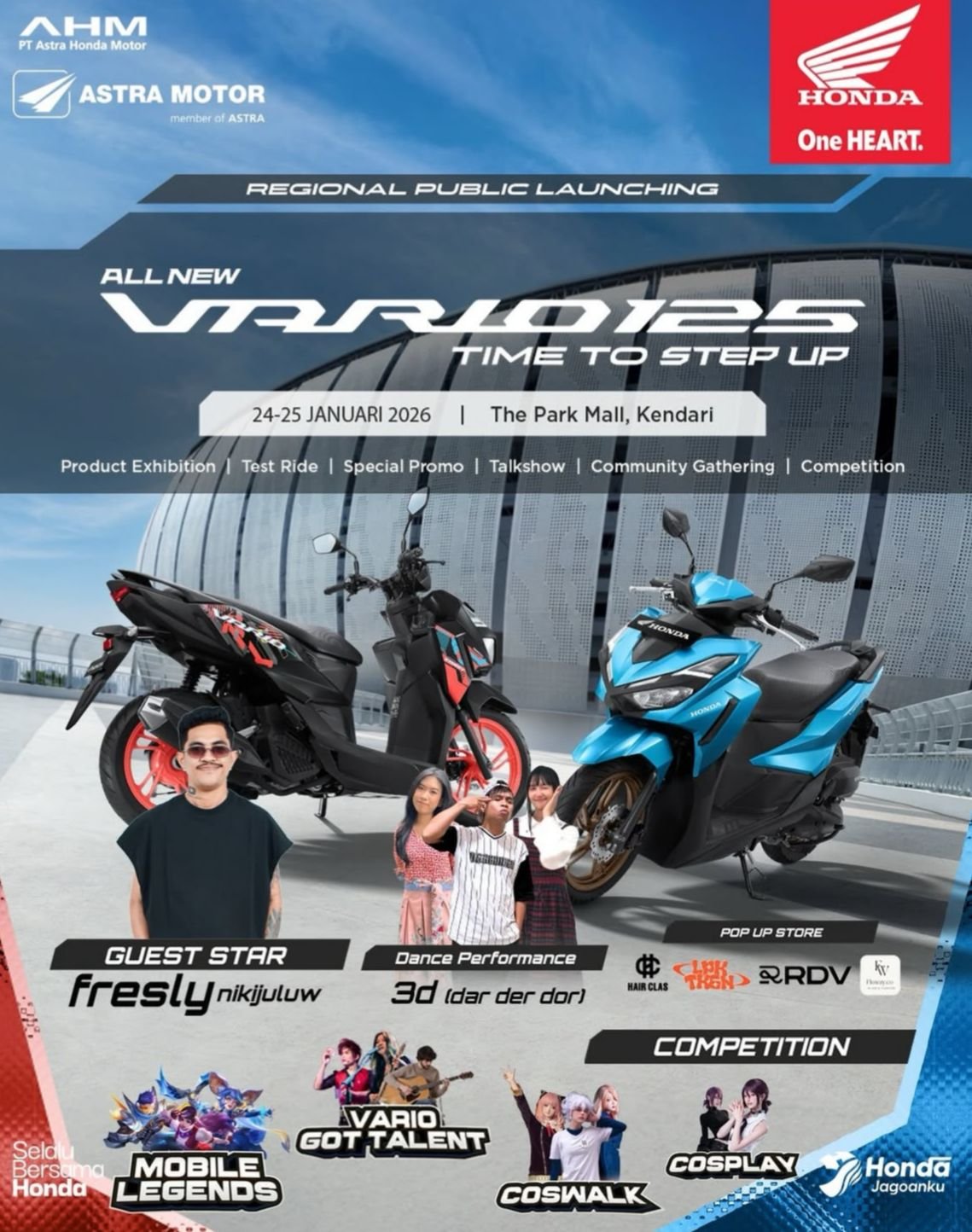 Kendari – Astra Motor Sulawesi Selatan (Sulsel) akan menggelar Regional Public Launching (RPL) All New Honda Vario 125 di The Park Mall Kendari pada 24 – 25 Januari 2026. Peluncuran ini dikemas meriah dengan menghadirkan musisi Fresly Nikijuluw sebagai guest star utama.