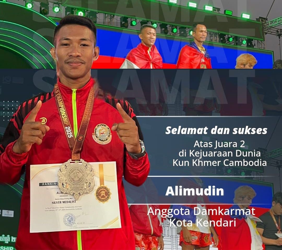 Kendari – Anggota Dinas Pemadam Kebakaran dan Penyelamatan (Damkarmat) Kota Kendari, Alimudin, menyabet medali perak di kejuaraan dunia 6th Kun Khmer World Championship yang digelar di Sihanoukville, Provinsi Preah Sihanouk, Kamboja pada 10 – 13 Februari 2026.