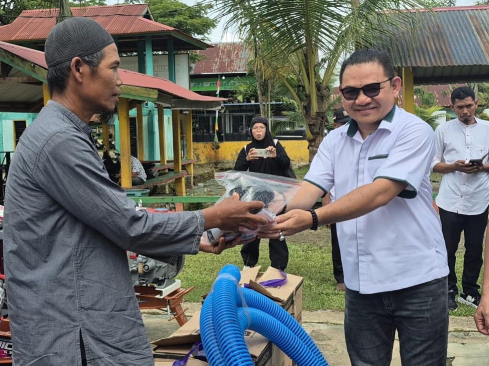 Anggota Dewan Perwakilan Rakyat (DPR) Republik Indonesia (RI) Komisi IV Dapil Sulawesi Tenggara (Sultra), Jaelani menyerahkan bantuan alsintan kepada perwakilan kelompok tani di Desa Ahuawatu, Kecamatan Pondidaha, Kabupaten Konawe. Foto: Herlis Ode Mainuru/Kendariinfo. (11/6/2025).