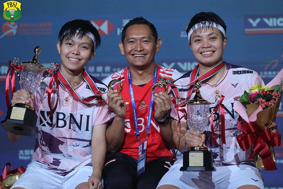 Apri/Fadia bersama sang pelatih usai memenangkan sektor ganda putri Hong Kong Open 2023. Foto: Dok. PBSI.
