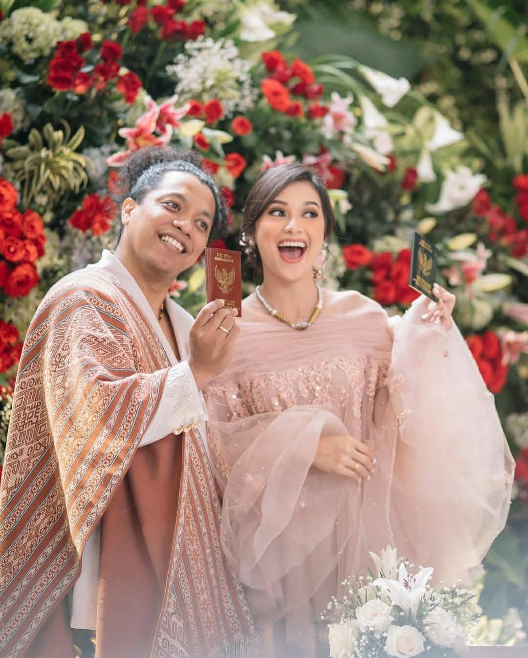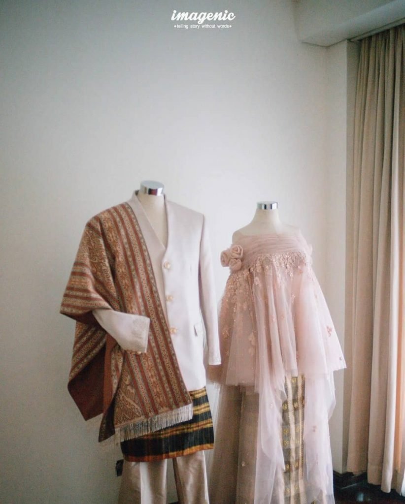 “Berpadu dua hati @arie_kriting dengan busana inspirasi Indonesia Timur dan @Indahpermatas dengan balutan inspirasi baju bodo. @arie_kriting memakai selendang kain NTT dengan sarung Wakatobi khas daerah asal dengan detail kalung papua yang dibuat dengan batang anggrek,” tulis sang desainer.