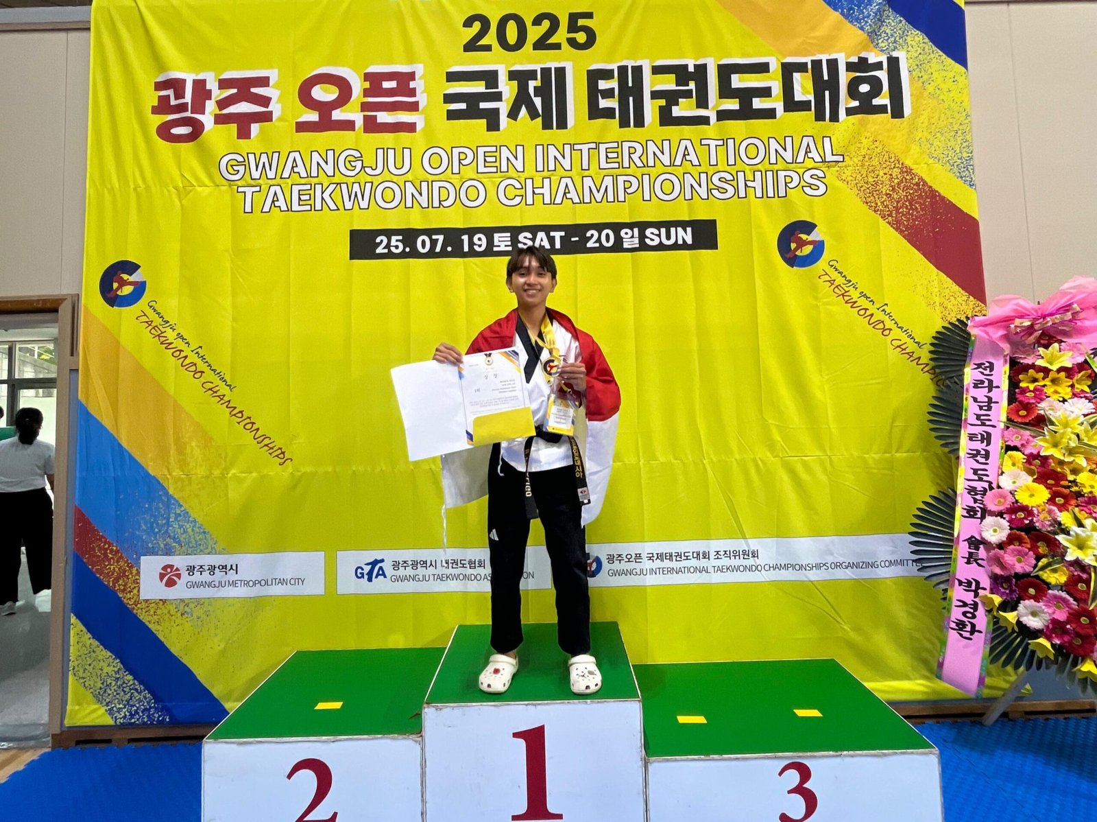 Rahmat Lagaligo saat berpose menunjukkan medali di podium usai berhasil meraih Juara 1 Turnamen Internasional Gwangju Korea Open 2025 dengan mengibarkan bendera Kabupaten Konawe.