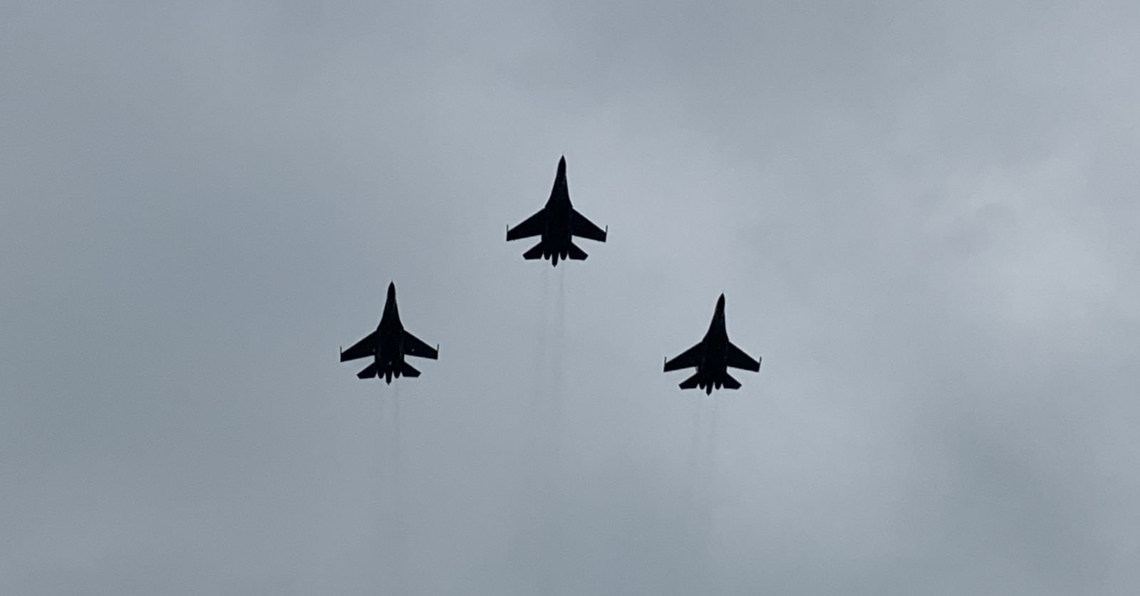 Kendari – Atraksi pesawat tempur jenis Sukhoi 27/30 milik TNI AU memeriahkan langit Kota Kendari saat upacara peringatan Hari Ulang Tahun (HUT) ke-59 Sulawesi Tenggara (Sultra), Kamis (27/4/2023).