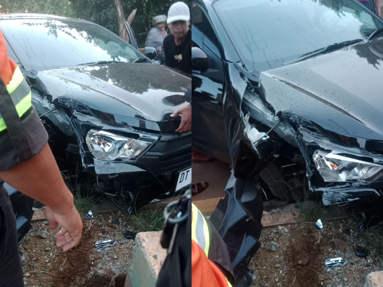 Akibat kejadian tersebut, mobil mengalami kerusakan pada bagian depan sebelah kanan, roda belakang sebelah kiri, serta airbag pada dashboard mengembang.