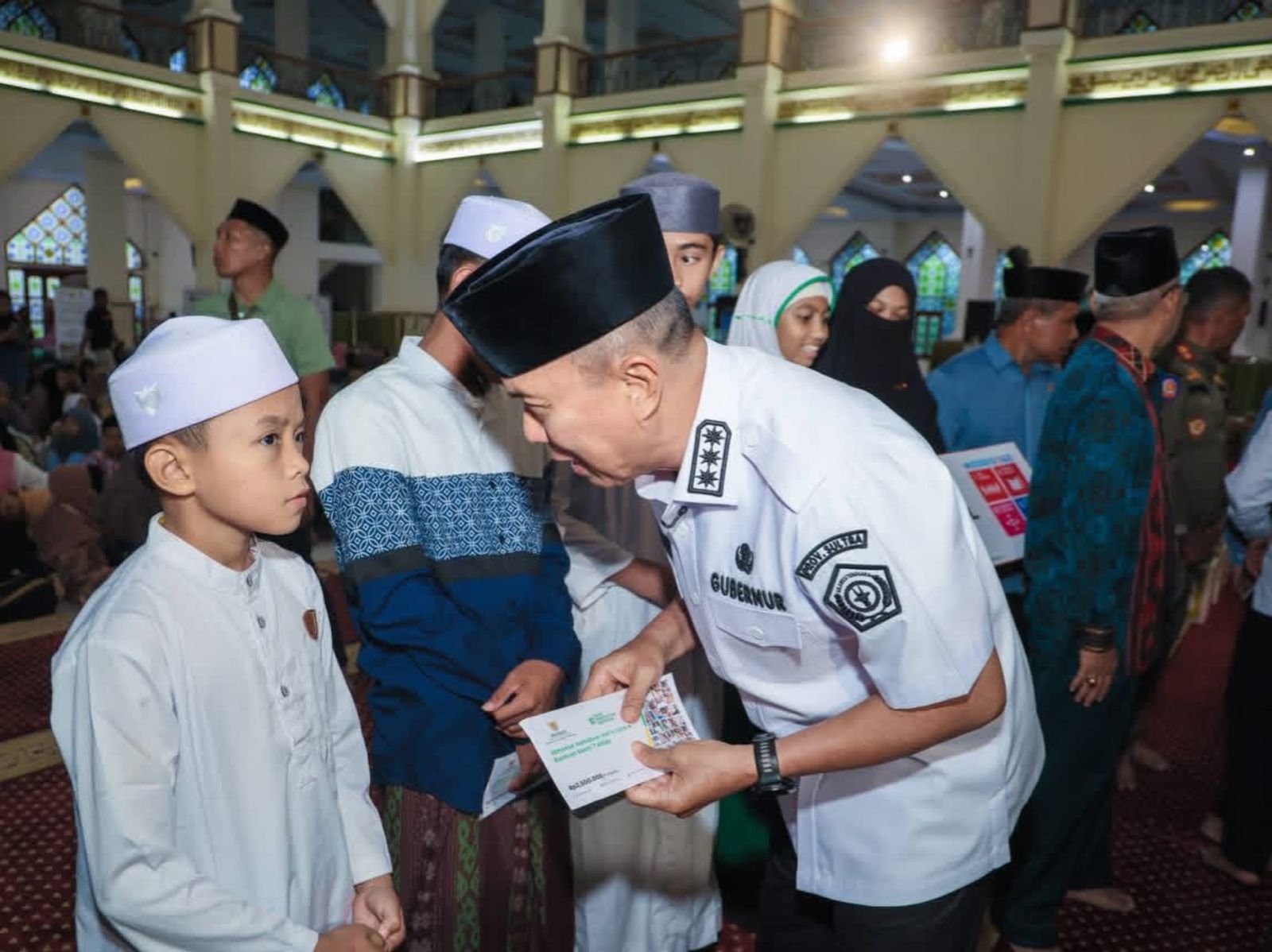 Gubernur Sultra, Andi Sumangerukka saat menyalurkan bantuan kepada salah satu anak di Masjid Raya Al-Kautsar Kendari. Foto: Dok. Pemprov Sultra/Laode Kaharmin. (18/3/2026).