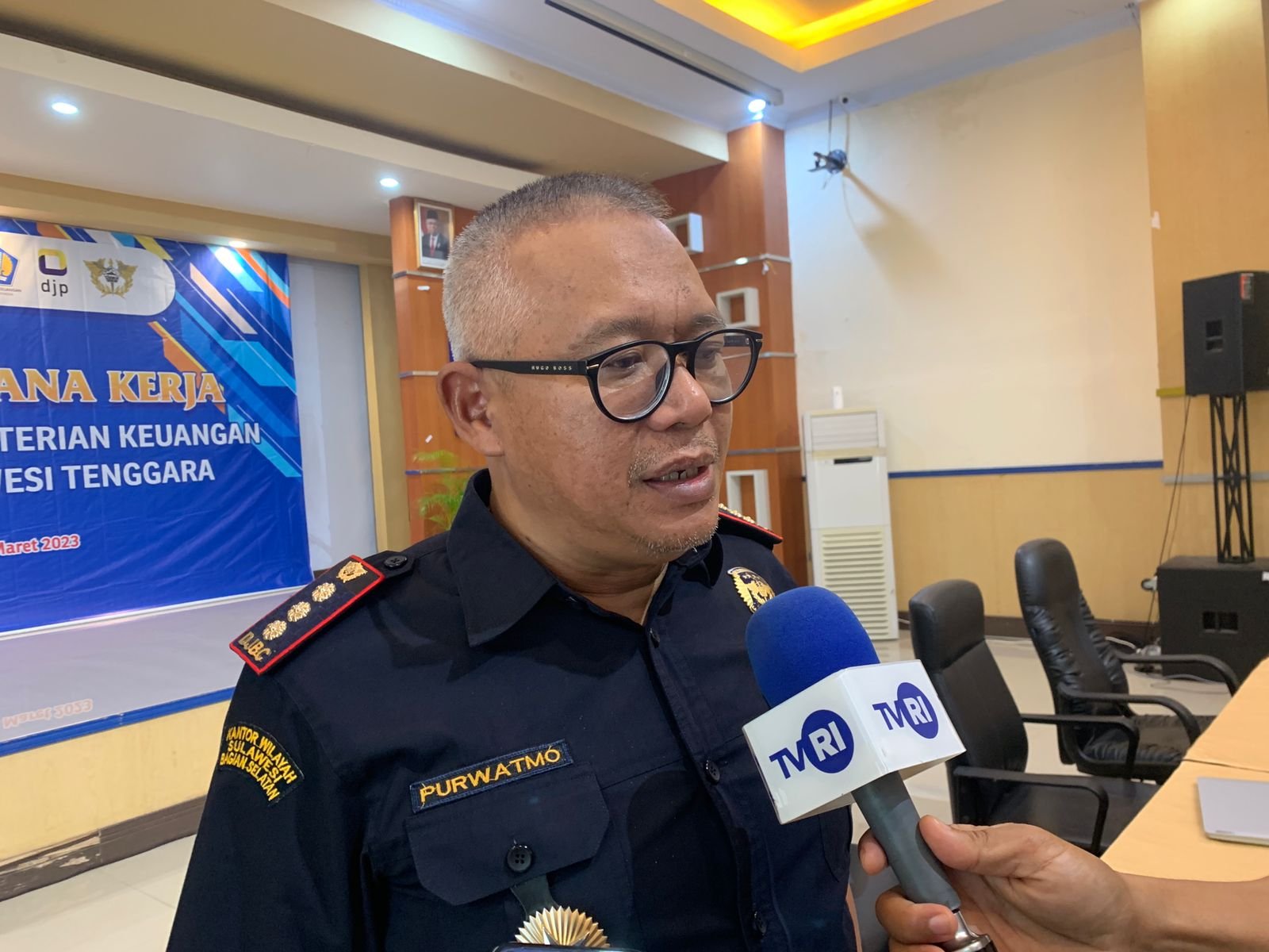 Kepala KPPBC Kendari, Purwoto Hadi Waluja saat diwawancarai awak media. Foto: Hasmin Ladiga/Kendariinfo. (28/3/2023).