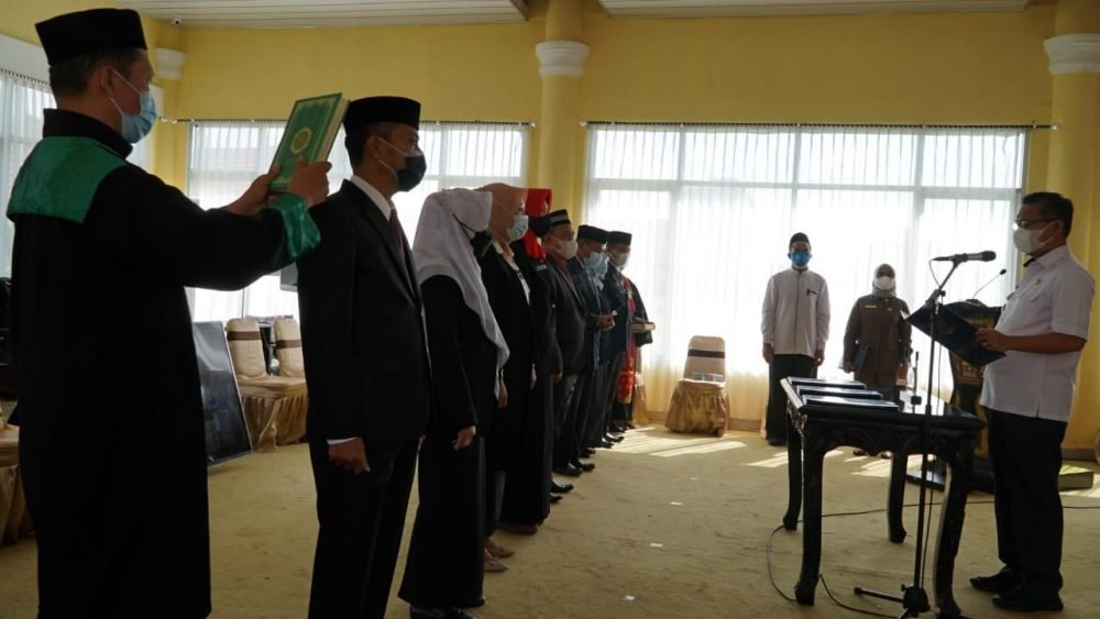 Puluhan pejabat dilantik secara virtual pagi ini, terdiri atas pejabat fungsional penilik satu orang, pejabat fungsional pengawas sekolah satu orang, dan dua orang Kepala TK, 48 orang Kepala SD, dan 12 orang Kepala SMP.