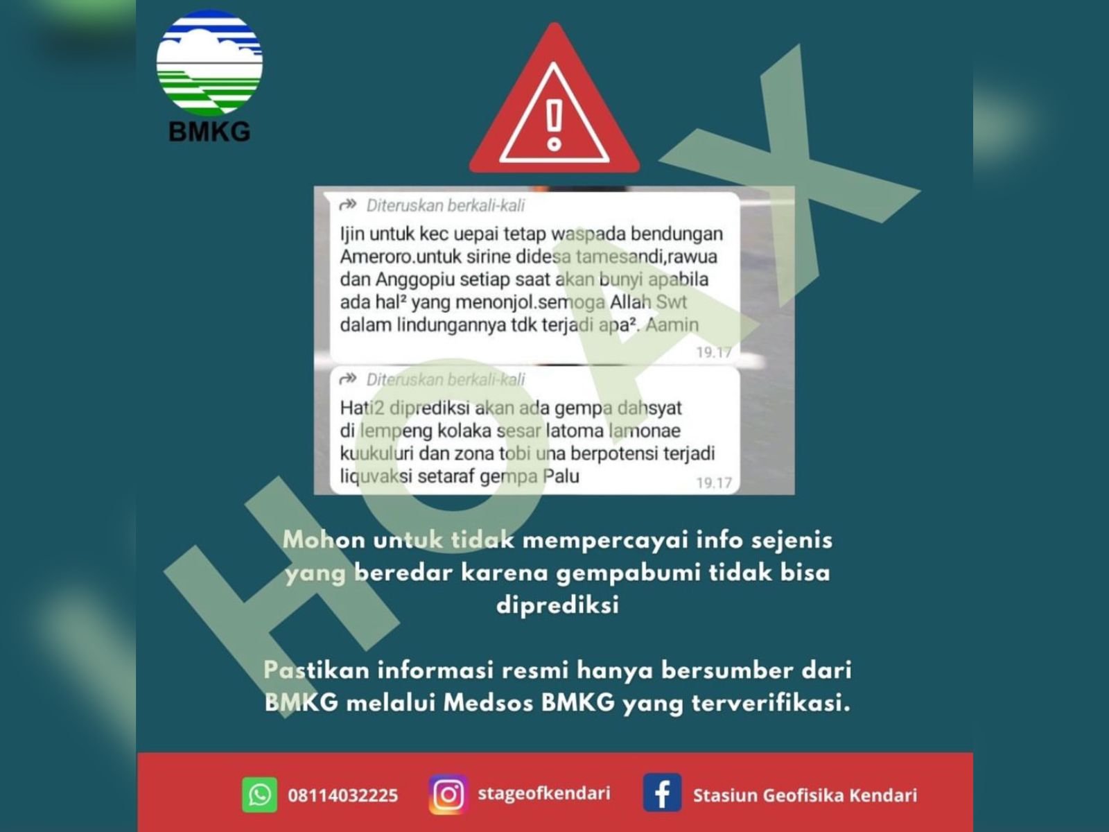 Stasiun Geofisika Kendari menyampaikan informasi terkait gempa dahsyat di Kabupaten Kolaka Timur (Koltim, Sulawesi Tenggara (Sultra), adalah hoax. Foto: Dok. Instagram/stageofkendari.