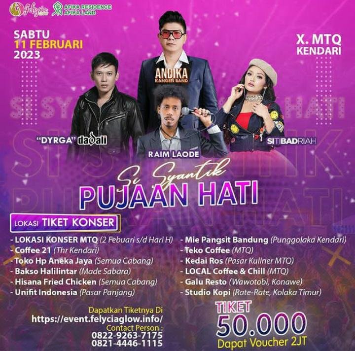 Konser musik ini persembahan dari Felycia Glow dan Afika Residence. Event ini diharapkan dapat memberikan hiburan tersendiri bagi masyarakat Sulawesi Tenggara (Sultra) khususnya Kota Kendari.