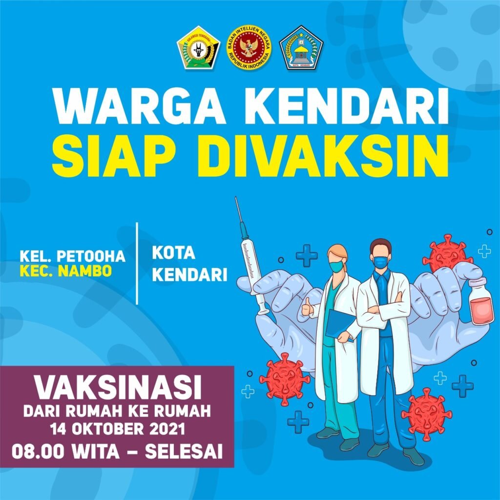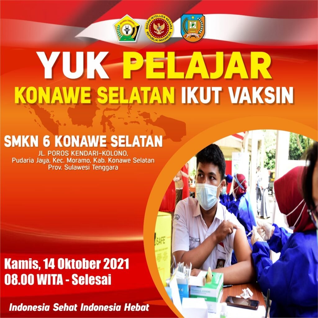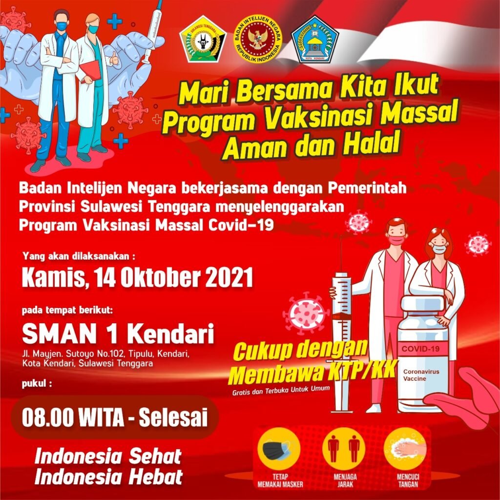 “Vaksin Covid-19 aman dan halal, mari warga dan pelajar Kota Kendari, Kabupaten Konawe, dan Kabupaten Konawe Selatan datang pada gerai vaksin BIN Daerah Sultra pada 14 Oktober 2021,” ujarnya.