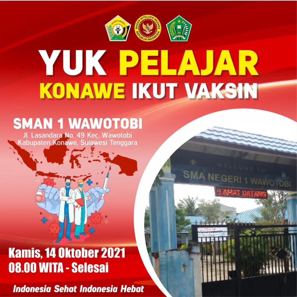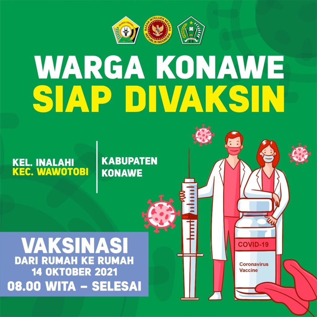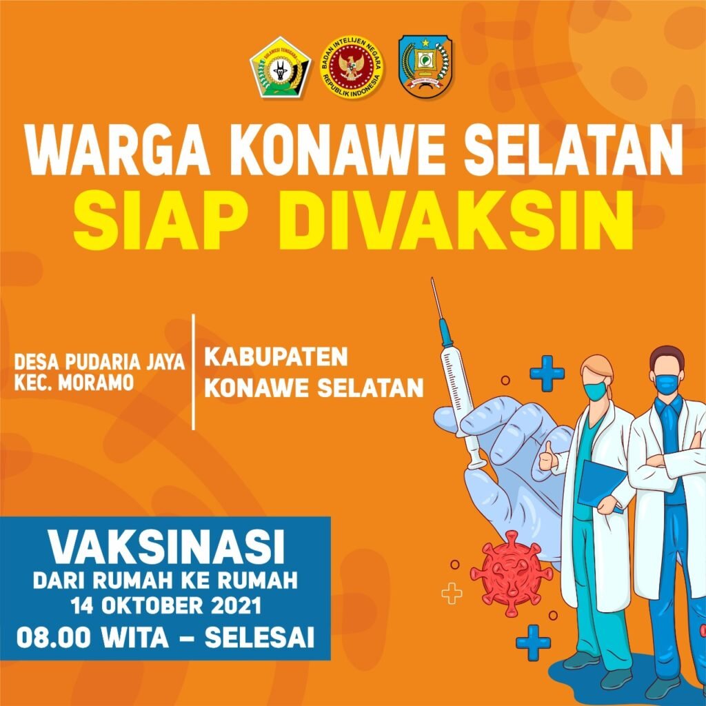 “Vaksin Covid-19 aman dan halal, mari warga dan pelajar Kota Kendari, Kabupaten Konawe, dan Kabupaten Konawe Selatan datang pada gerai vaksin BIN Daerah Sultra pada 14 Oktober 2021,” ujarnya.
