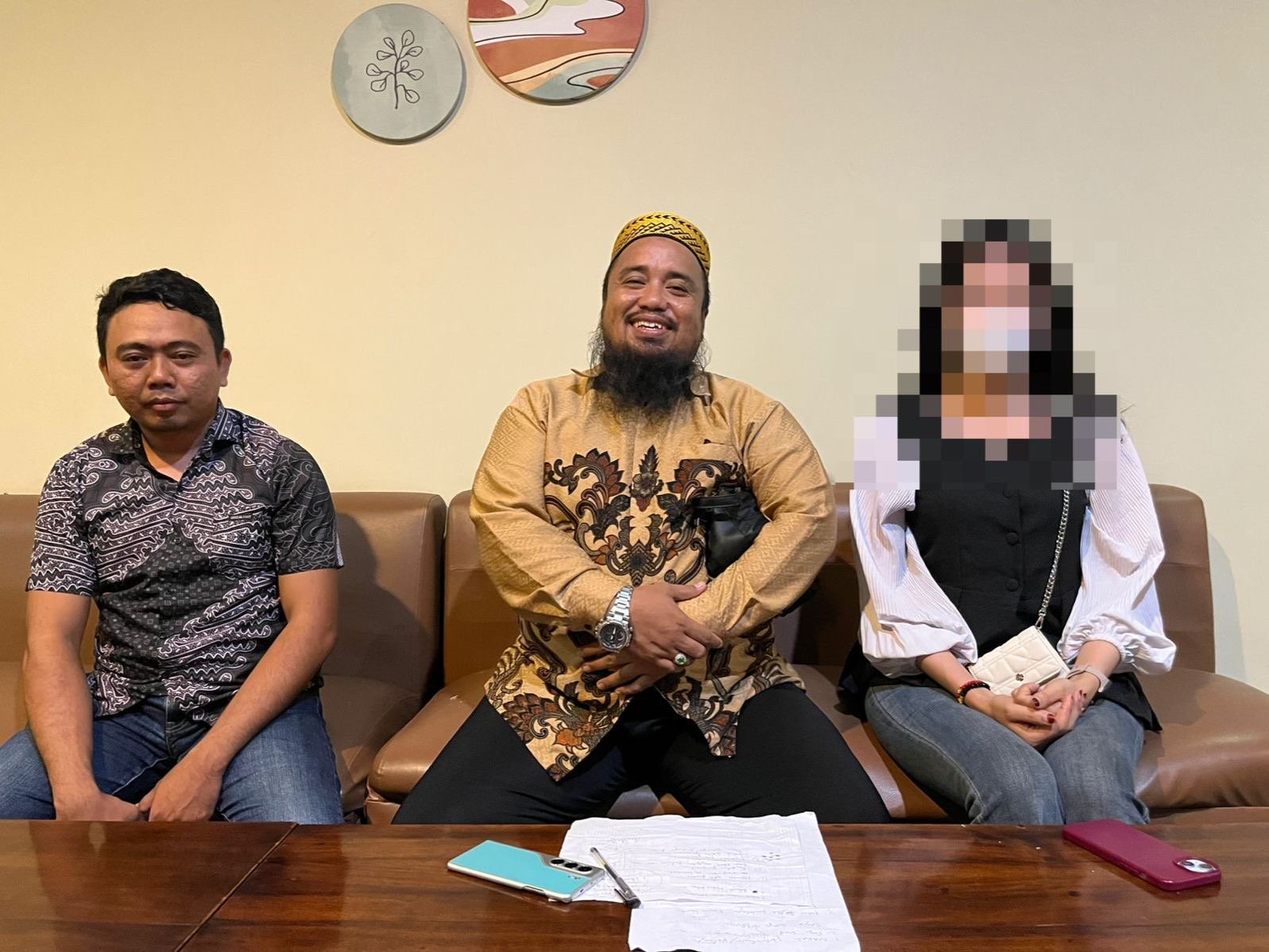 Bhayangkari berinisial W (kanan) bersama kuasa hukumnya, Muhammad Saleh (tengah) saat memberikan keterangan resmi terkait penggerebekan di Kota Kendari. Foto: Kendariinfo. (21/4/2026).
