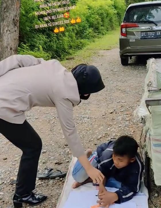 Melihat kegigihannya, @nirwahida39 yang juga merupakan seorang polisi wanita (polwan) menghampiri bocah itu.
