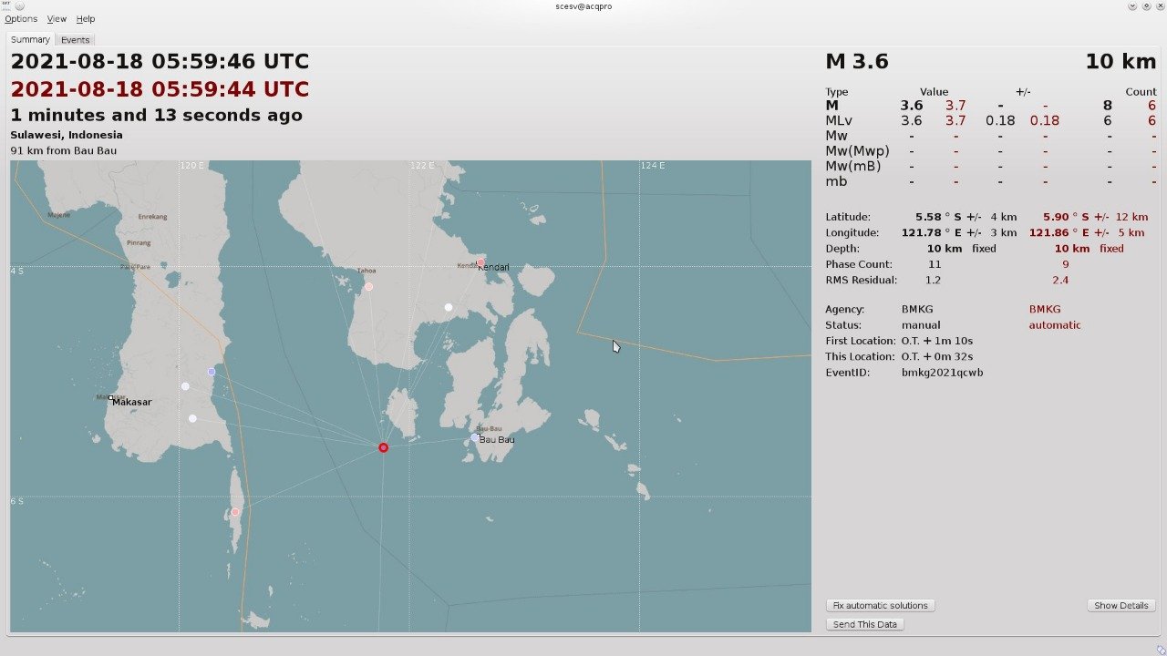 Bombana – Gempa bumi berkekuatan 3,6 skala richter (SR) mengguncang Sulawesi Tenggara (Sultra), tepatnya di wilayah Kabaena Selatan, Kabupaten Bombana, Rabu (18/8/2021).