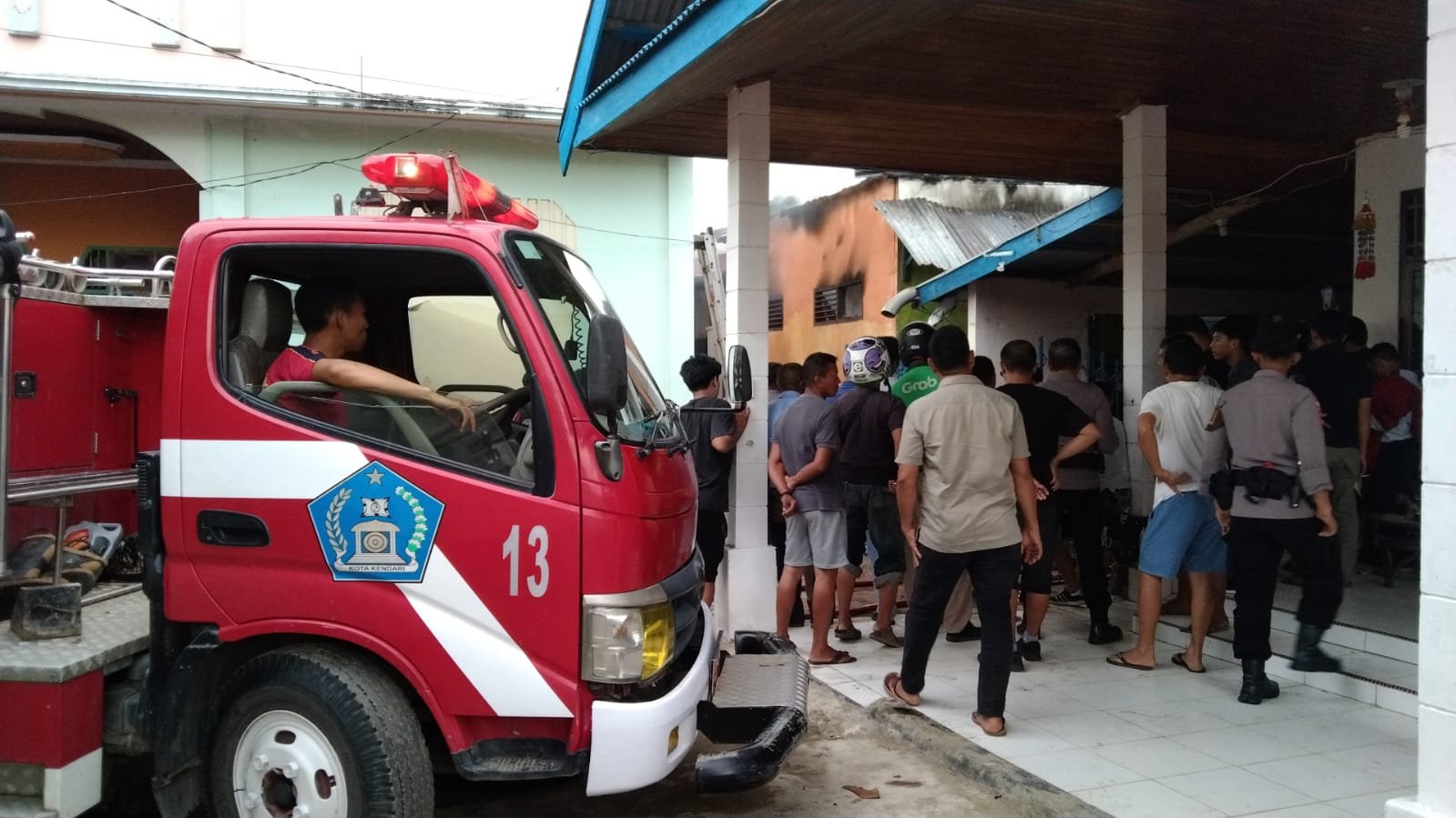 Suasana saat mobil pemadam kebakaran melakukan pemadaman api di sebuah indekos di Kendari. Foto: Herlis Ode Mainuru/Kendariinfo. (10/1/2023).
