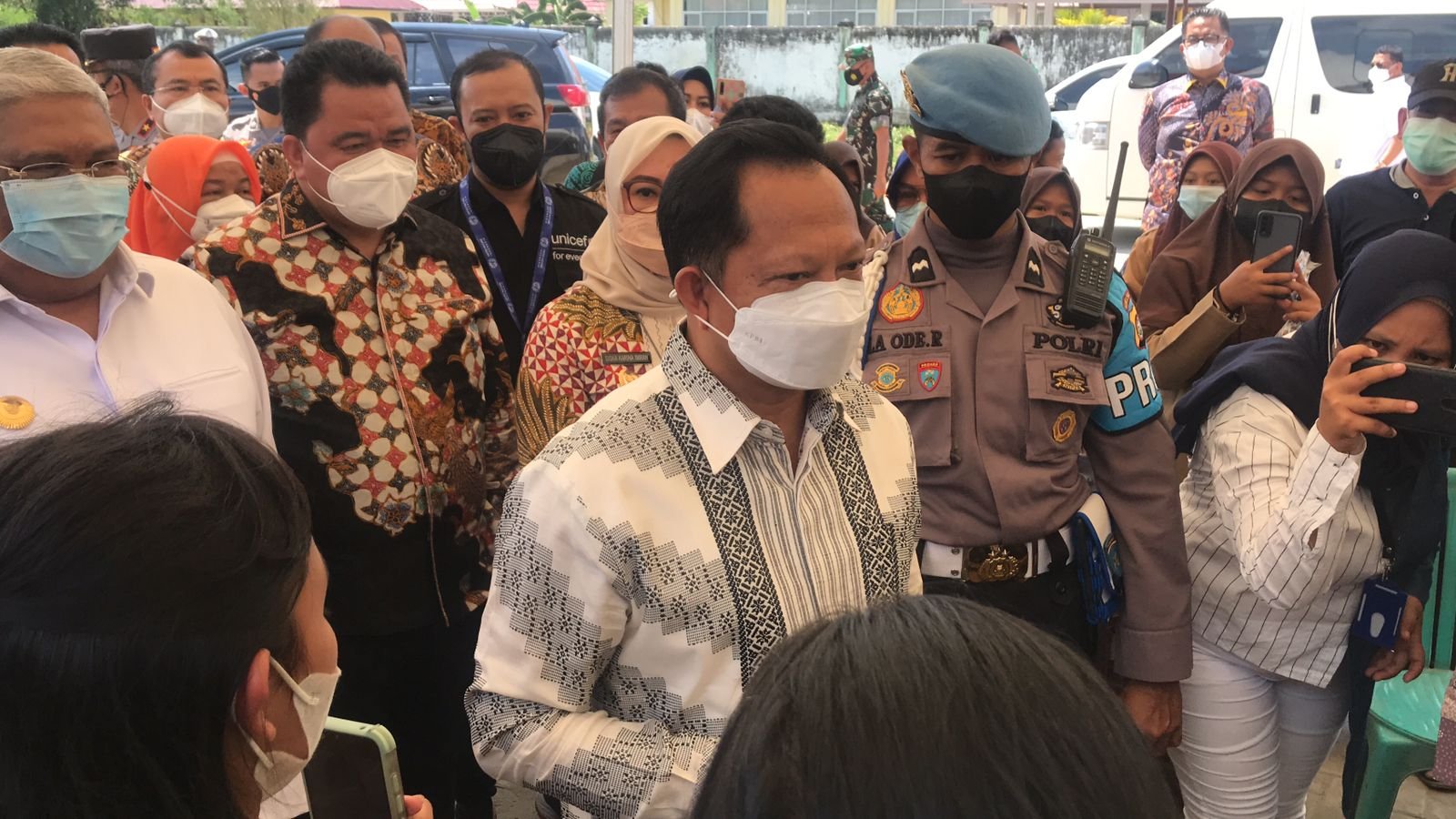 Kendari – Menteri Dalam Negeri (Mendagri), Tito Karnavian tiba di Kendari dan langsung melakukan kunjungan kerja memantau vaksinasi Covid-19 di Kantor Dinas Kesehatan (Dinkes) Kota Kendari, Sabtu (11/12/2021).