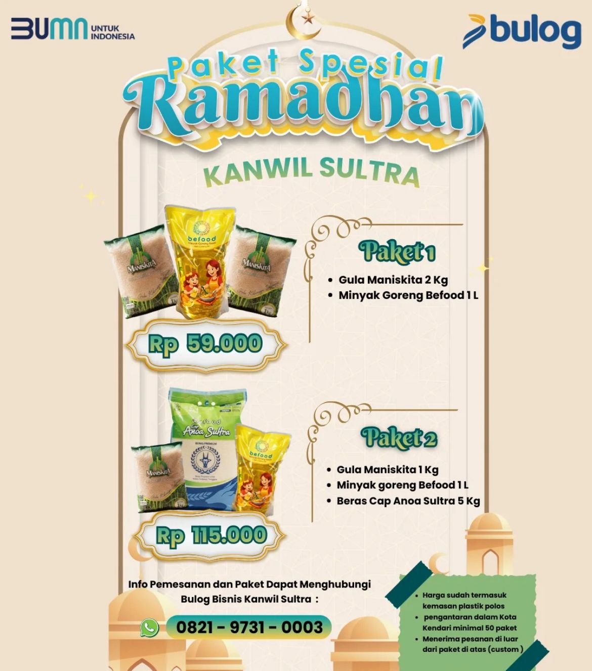 Asisten Manager Bulog Kanwil Sultra, Muhammad Tri Saputra, mengatakan pihaknya menyediakan dua jenis paket Ramadan tahun ini, yakni paket sembako berisikan 2 kilogram gula Manis Kita dan 1 liter minyak goreng Befood dengan harga Rp59 ribu. Paket kedua terdiri atas 5 kilogram beras premium jenis Anoa, 1 kilogram gula Manis Kita, dan 1 liter minyak goreng Befood dengan harga Rp115 ribu.