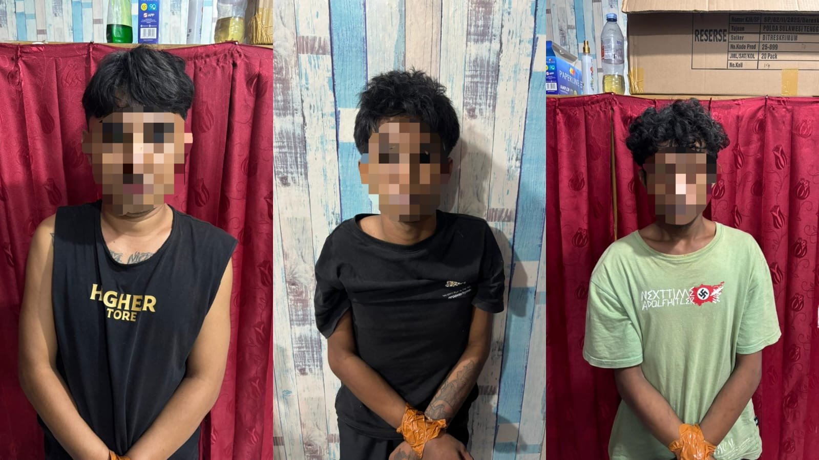 Kasat Reskrim Polresta Kendari, AKP Welliwanto Malau, menjelaskan ketiga pelaku yang diamankan masing-masing berinisial DA (18), RU (23), dan DI (20). Ketiganya ditangkap di Jalan Gatot Subroto, Kelurahan Bukit Wolio Indah, Kecamatan Wolio, Kota Baubau, Sulawesi Tenggara (Sultra), setelah polisi melakukan penyelidikan berdasarkan bukti permulaan yang cukup.