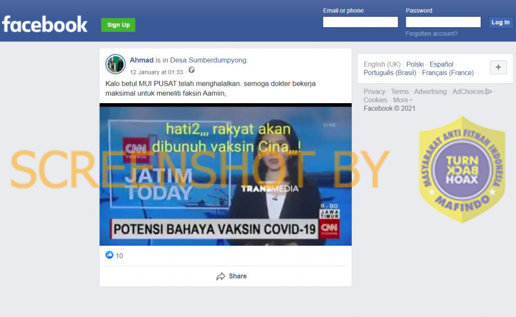 Pro dan kontra terjadi, banyak masyarakat yang telah termakan berita bohong seputar dampak buruk covid-19. Hoax Buster laman Resmi Satgas Covid-19 indonesia mengonfirmasi beberapa berita bohong yang tersebar di media sosial, salah satunya unggahan di Facebook yang memperlihatkan tangkapan layar video CNN yang memberitakan rakyat akan dibunuh oleh vaksin dari tiongkok. Setelah ditelusuri ternayata berita tersebut termasuk berita menyesatkan.