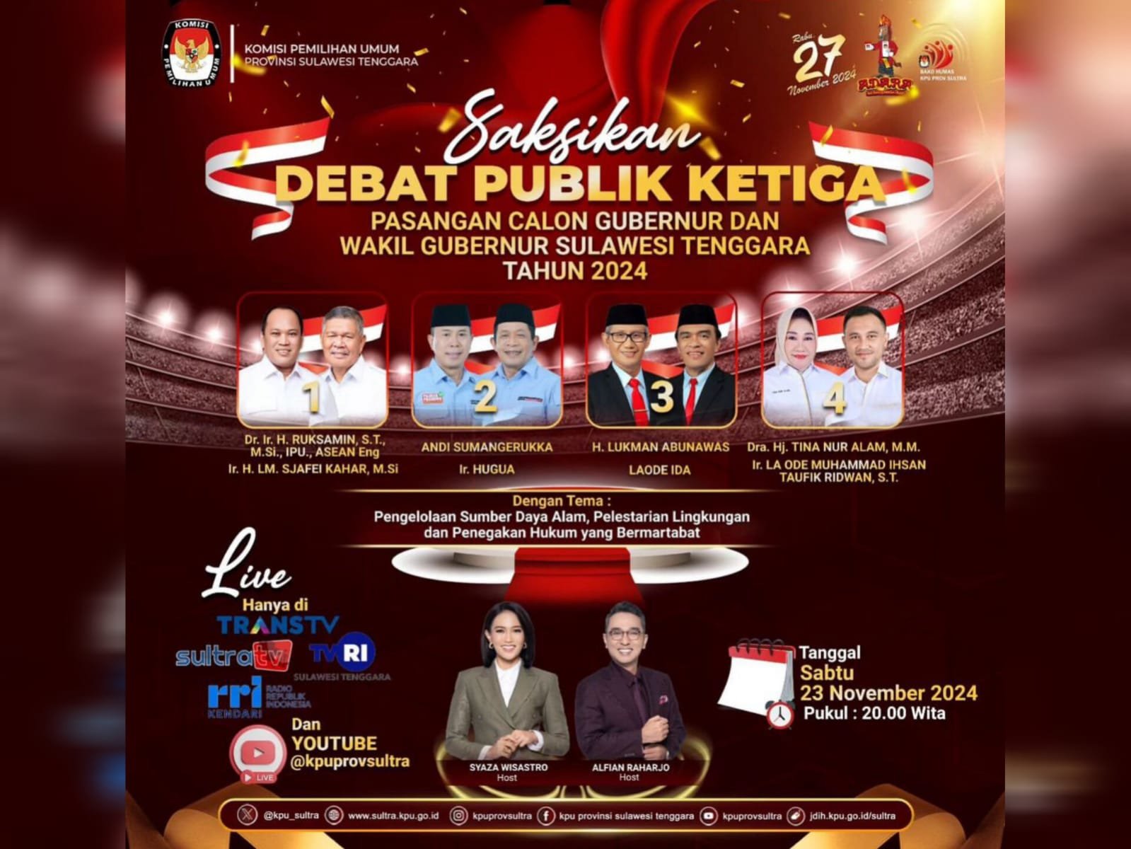Jalannya debat ketiga akan disiarkan langsung Trans TV, Sultra TV, TVRI Sultra, RRI Sultra, dan live melalui akun YouTube KPU Sultra.