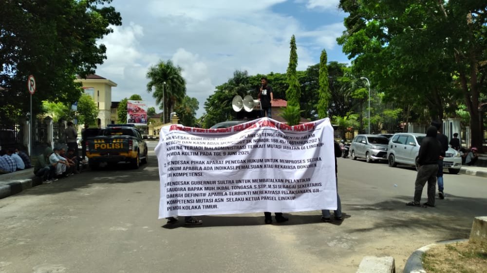 Kendari – Koalisi Penyelamat Kolaka Timur (Koltim) melakukan aksi demonstrasi di depan Kantor Gubernur Sulawesi Tenggara (Sultra), menuntut pembatalan dari mutasi sejumlah Aparatur Sipil Negara (ASN), Senin (25/10/2021).