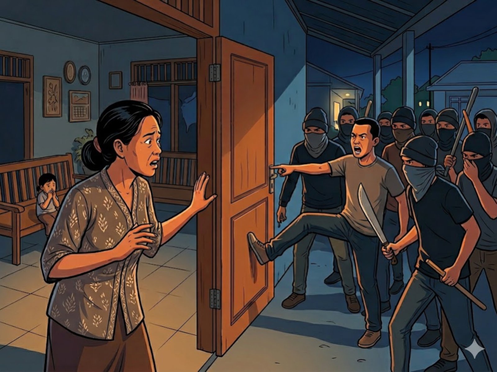 “Dari depan rumah mereka berteriak panggil nama anakku sambil bilang, ‘Keluar, kami mau bunuh kamu.’ Saya bangun kaget, lalu buka jendela, langsung tanya ada apa. Mereka mendobrak pintu dan masuk ke rumah untuk menggeledah mencari anak saya,” ungkapnya.