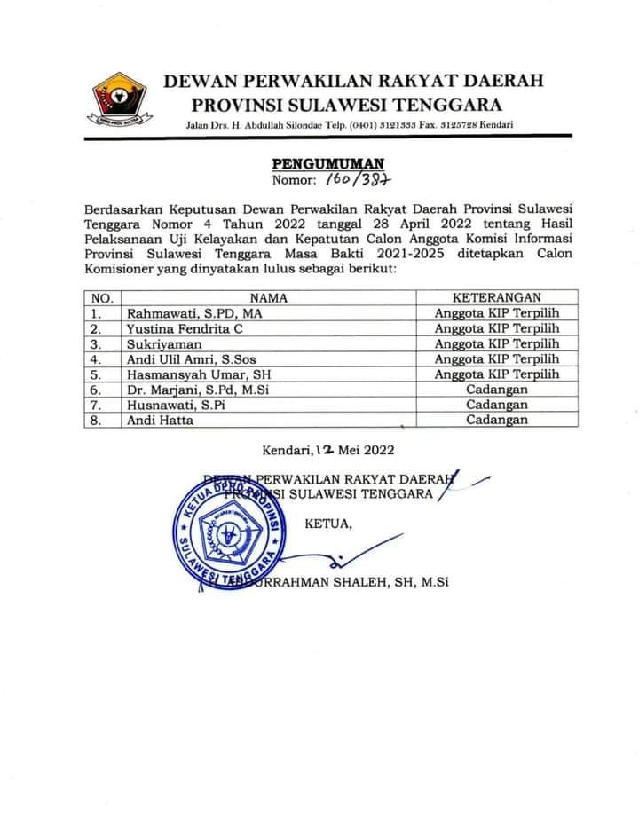 Pengumuman dengan Nomor: 160/387 tanggal 12 Mei 2021 yang ditandatangani Ketua DPRD Sultra Abdurrahman Shaleh tersebut mencantumkan lima orang anggota KI terpilih dan tiga orang cadangan.
