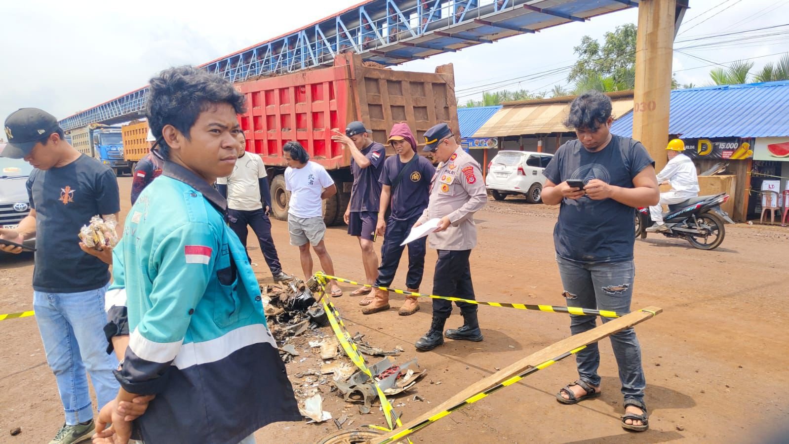 Petugas kepolisian saat melakukan olah tempat kejadian perkara (TKP) kecelakaan antara sepeda motor dan dump truk 10 roda di perempatan Desa Lalimbue Jaya, Kecamatan Kapoiala, Kabupaten Konawe. Foto: Istimewa. (4/2/2026).