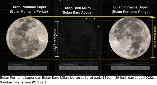 Melansir Brin.go.id, akan terjadi tiga fenomena antariksa yaitu, Purnama Stroberi Super (Full Strawberry Supermoon), Bulan Baru Stroberi Mikro (New Strawberry Supermoon), dan Purnama Rusa Super (Full Buck Supermoon).