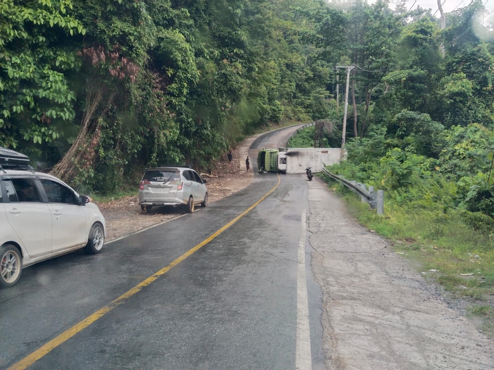 Gagal Menanjak, Truk Ekspedisi Bermuatan Ayam Beku Terbalik di Tanjakan Sarimi, Kolut