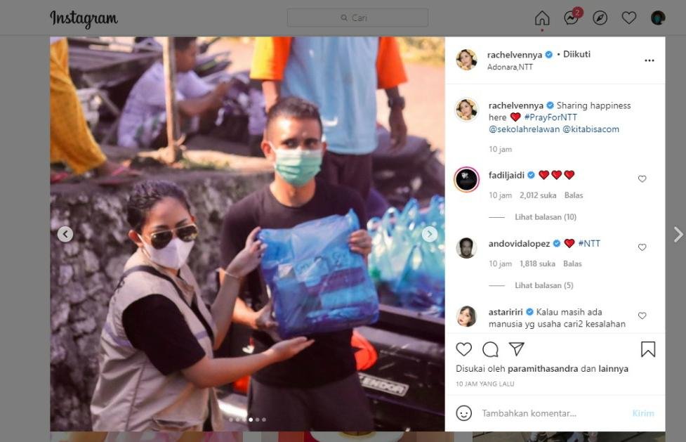 Dalam unggahan terbarunya, Kamis (8/4/2021), Rachel terlihat turun langsung di lokasi banjir bandang di Desa Adonara, NTT untuk menyalurkan bantuan yang telah terkumpul. Ia tampak bersama rekan selebgramnya seperti Fadil Jaidi, Keanu Angelo, Andovi Da Lopez, dan juga Jovial Da Lopez.