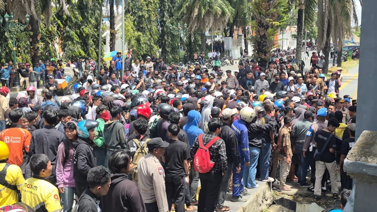 Pantauan Kendariinfo pukul 11.15 Wita di lokasi menunjukkan, ratusan massa berkumpul dan mulai memadati area sekitar gedung DPRD Sultra. Situasi sempat memanas ketika sebagian pendemo mencoba memaksa masuk ke dalam gedung, sehingga terjadi aksi saling dorong dengan aparat keamanan.