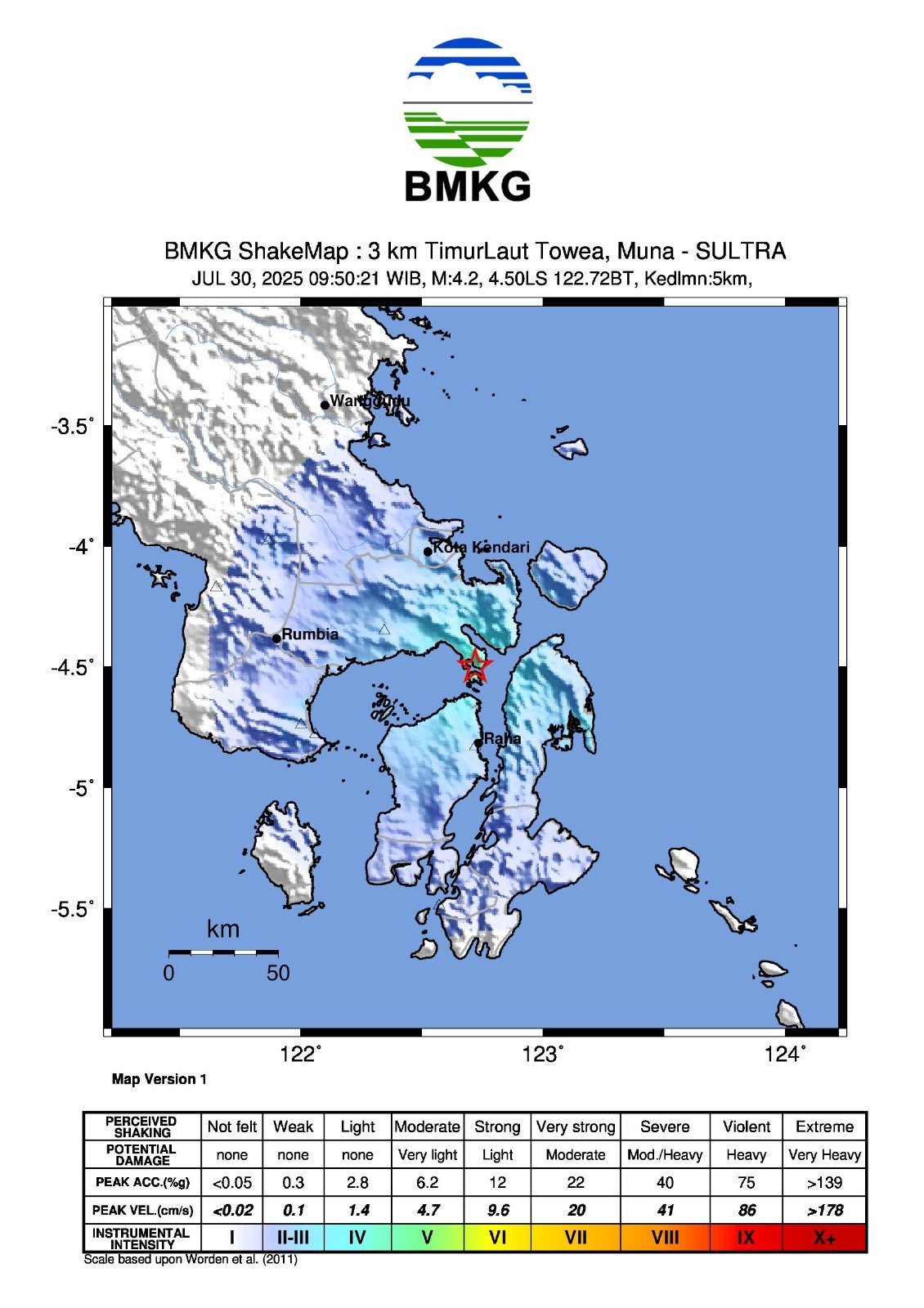 Gempa M 4,2 Guncang Muna, Dirasakan di Buton Utara dan Konawe Selatan
