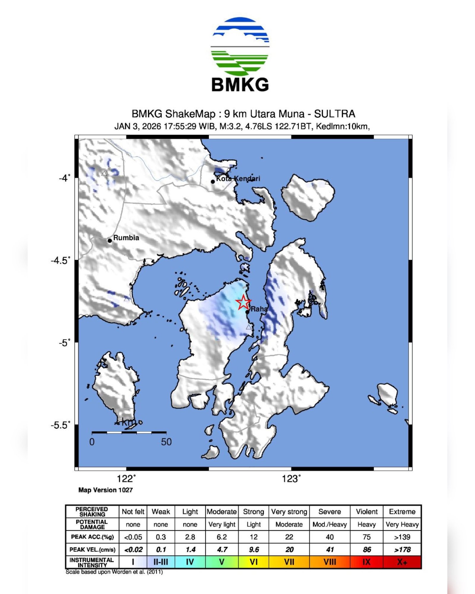 “Berdasarkan peta guncangan (shakemap) dan laporan masyarakat, gempa dirasakan di wilayah Lasalepa dan Watopute di Muna, dan Kusambi di Muna Barat dengan skala intensitas II–III MMI,” jelasnya.