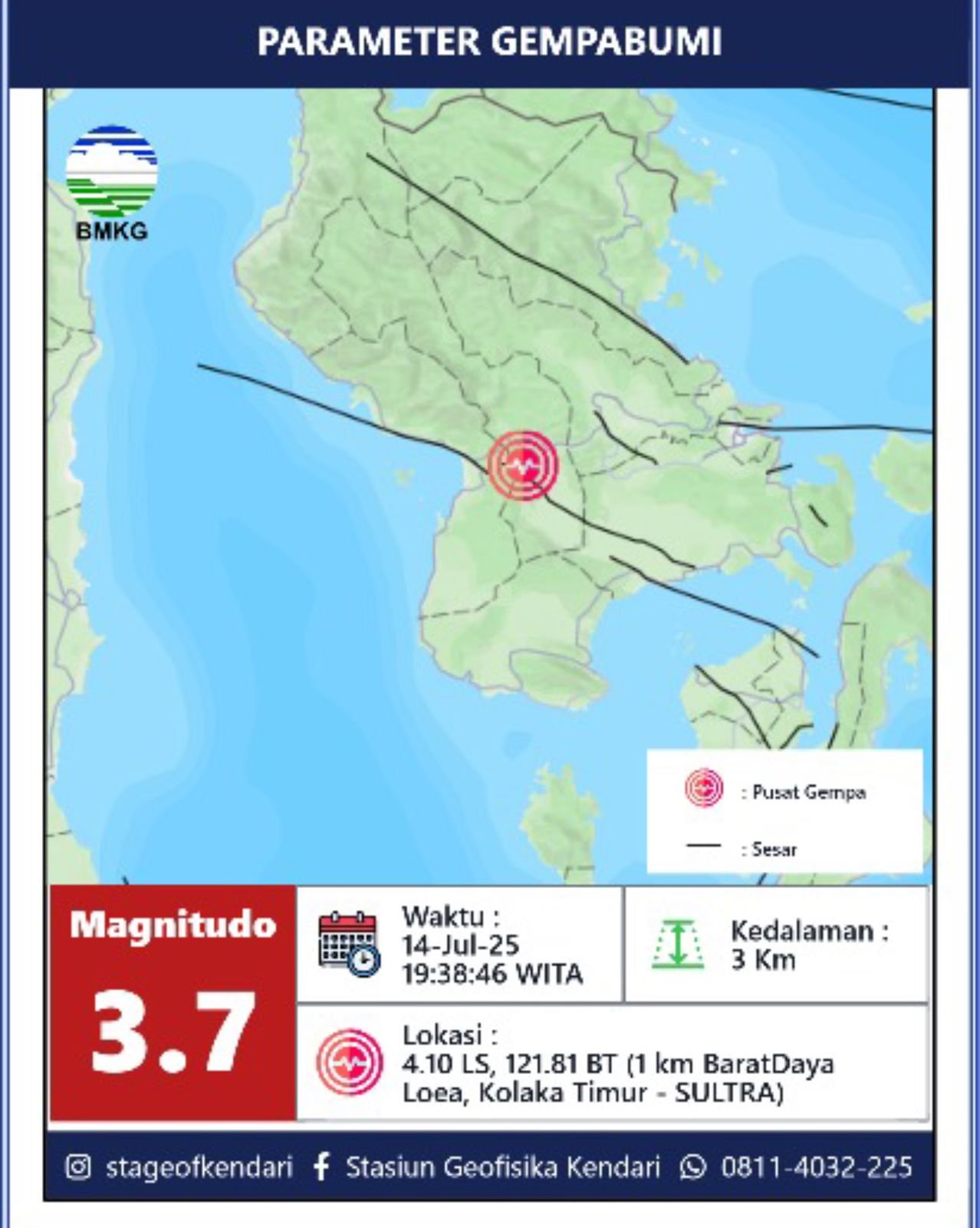 “Gempa dengan magnitudo 3,7 di barat daya Kecamatan Loea, Kolaka Timur,” tulis BMKG Kendari dalam keterangan resminya.