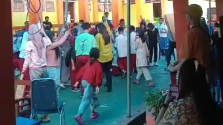 Dalam sebuah video yang diterima Kendariinfo, sekelompok siswa dan siswi yang masih menggunakan pakai merah putih (pakaian SD) saling berbaur asyik menggelar pesta joget bersama di bawah tenda yang terpasang depan ruang kelas.
