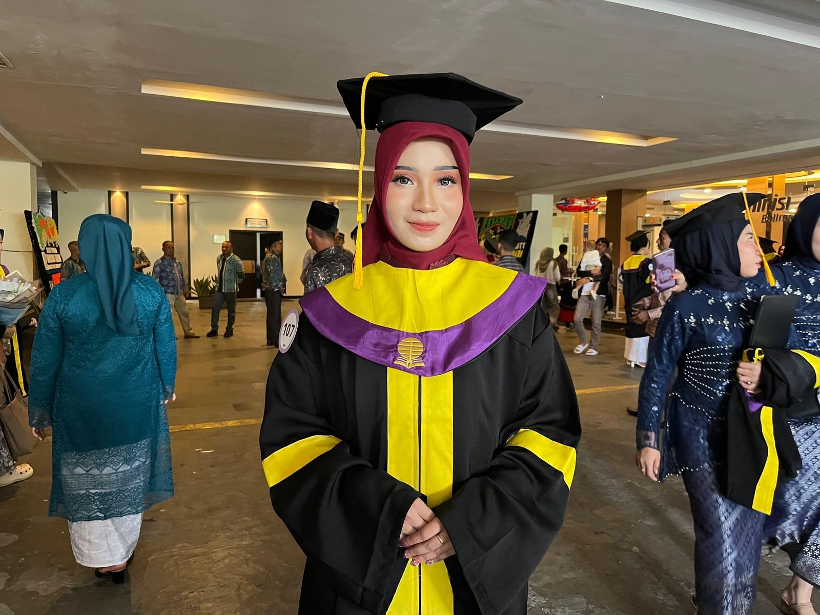 “Alhamdulillah sangat bersyukur, perjalanan kuliah kurang lebih empat tahun sudah terbayar lunas,” ujar Nining penuh haru saat ditemui usai wisuda.