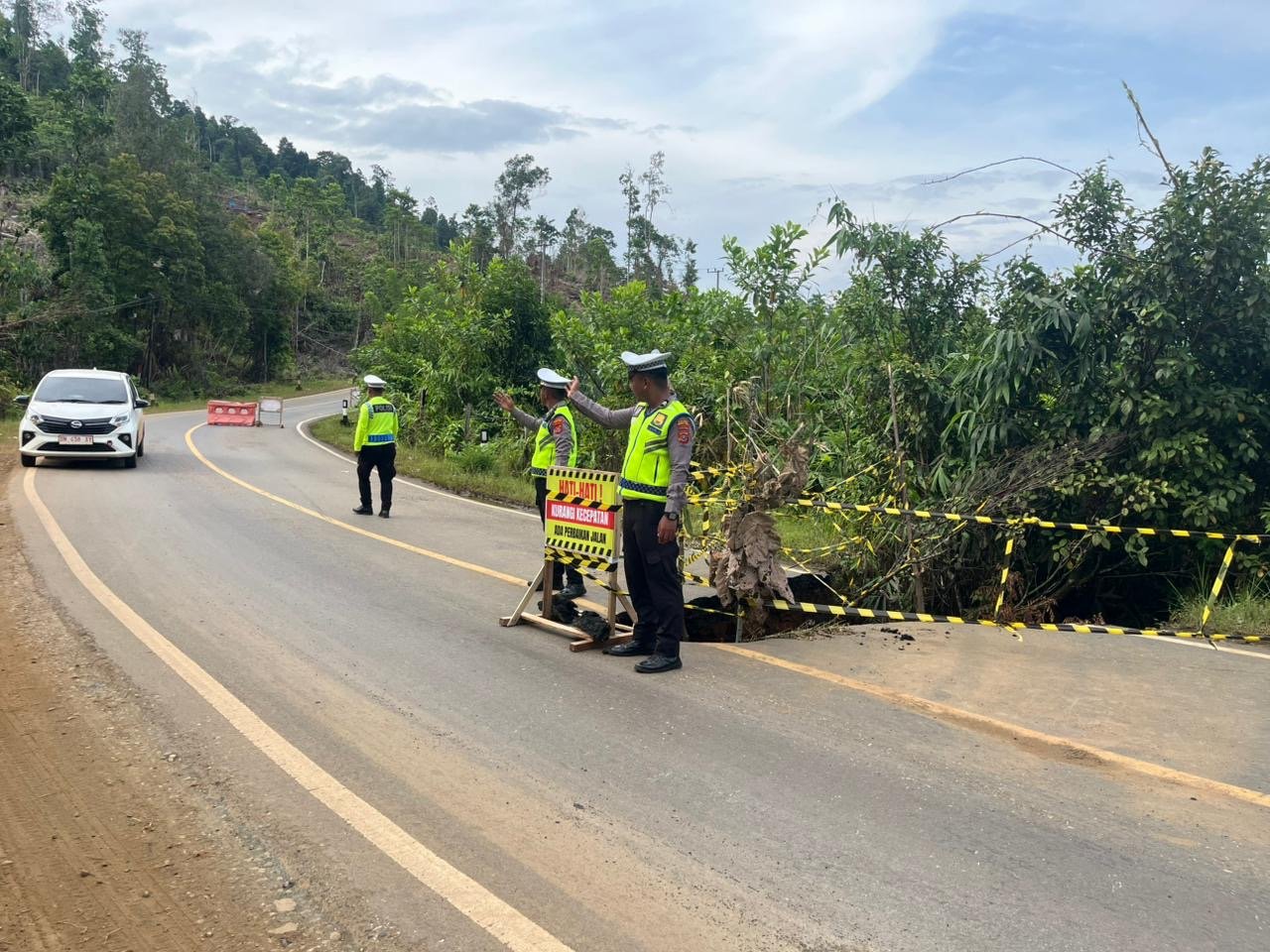 “Kami juga melakukan pengaturan arus lalu lintas di lokasi serta berkoordinasi dengan pihak terkait agar penanganan jalan ini bisa segera dilakukan. Kami mengimbau masyarakat untuk selalu berhati-hati saat melintas di jalur tersebut,” tambahnya.