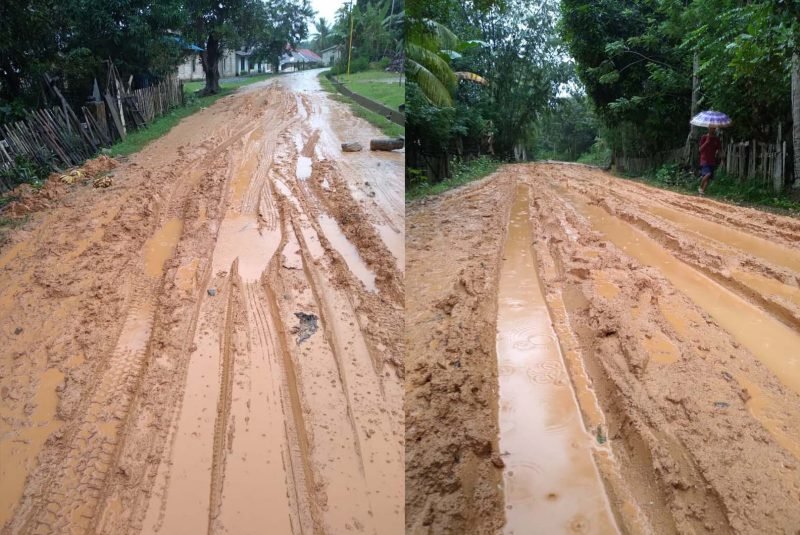 Struktur jalan lunak yang terdiri dari tanah kuning, hancur saat diguyur hujan. Ditambah dengan truk bermuatan material keluar masuk melewati jalanan ini sehingga memperburuk kondisi jalan tersebut.