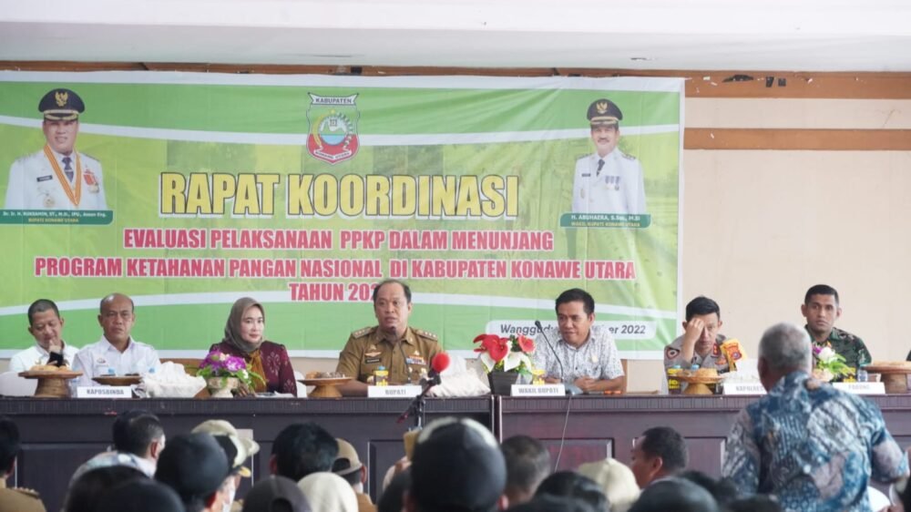 Konawe Utara – Bupati Konawe Utara (Konut), Ruksamin mengundang seluruh camat, lurah, dan kepala desa (kades) melakukan rapat koordinasi untuk meningkatkan ketersediaan pangan daerah, Senin (10/10/2022).