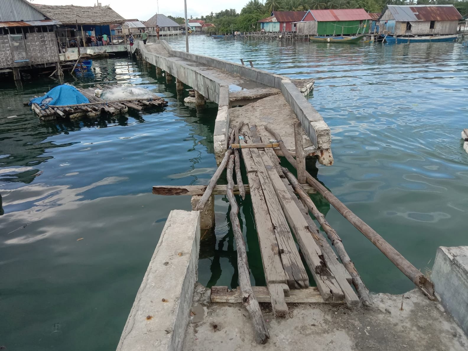 Sudin selaku warga setempat, menyampaikan saat ada bagian jembatan yang mulai retak, warga tidak lagi melewatinya. Bagian yang retak tersebut segera dijatuhkan ke laut, lalu diganti dengan kayu. Perbaikan sederhana itu dilakukan warga agar akses pejalan kaki tidak terhambat.