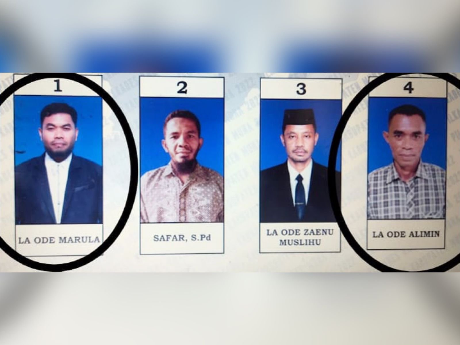 Rinciannya, La Ode Marulu (adik) nomor urut 1, Safar nomor urut 2, La Ode Zaenu Muslihu nomor urut 3, dan La Ode Alimin (kakak) sendiri nomor urut 4.