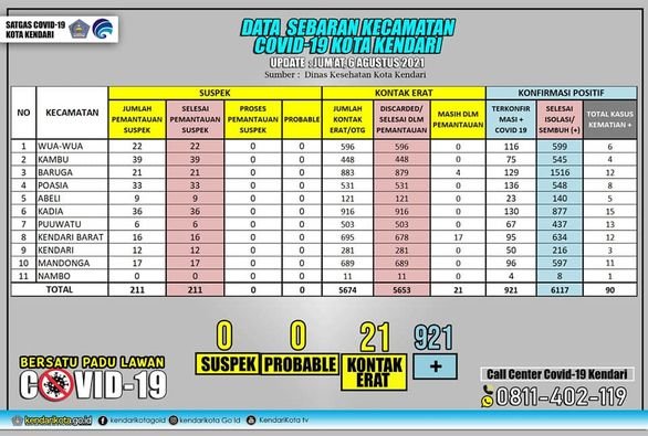 Sedangkan Kecamatan Mandonga mencatat penambahan kasus konfirmasi positif Covid-19 tertinggi yaitu sebanyak 10 orang. Kecamatan Wuawua sebanyak 8 orang, Kecamatan Baruga dan Poasia 7 orang, Kecamatan Kendari Barat 6 orang, Kecamatan Kadia 5 orang, Kecamatan Kambu dan Puuwatu 4 orang, sisanya Kecamatan Kendari 2 orang dan Abeli 1 orang.