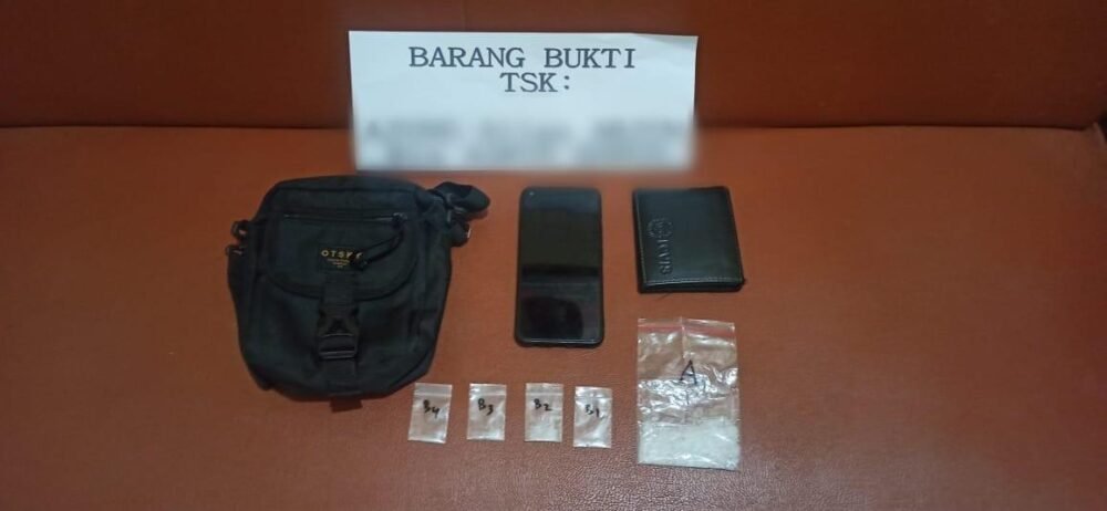 Penggeledahan badan terhadap AJ ditemukan satu saset plastik bening besar yang disimpan di tas selempang dan empat saset ukuran kecil sabu-sabu di dalam dompet dengan berat 7,85 gram.