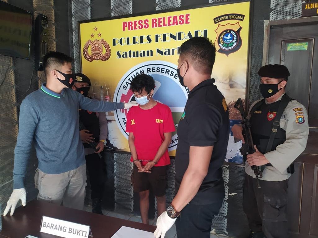 Pelaku tindak pidana narkotika jenis sabu-sabu, LD (22) saat dibawa ke Polres Kendari.