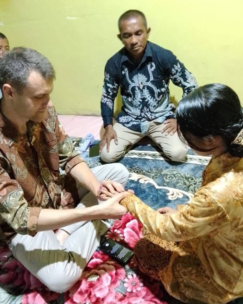 Buton Utara – Bule asal Rusia, Dmitrii Vivatenko (39) melamar kekasihnya, Anggela (25) di Kecamatan Kulisusu, Kabupaten Buton Utara (Butur), Sulawesi Tenggara (Sultra), Rabu (26/11/2025).