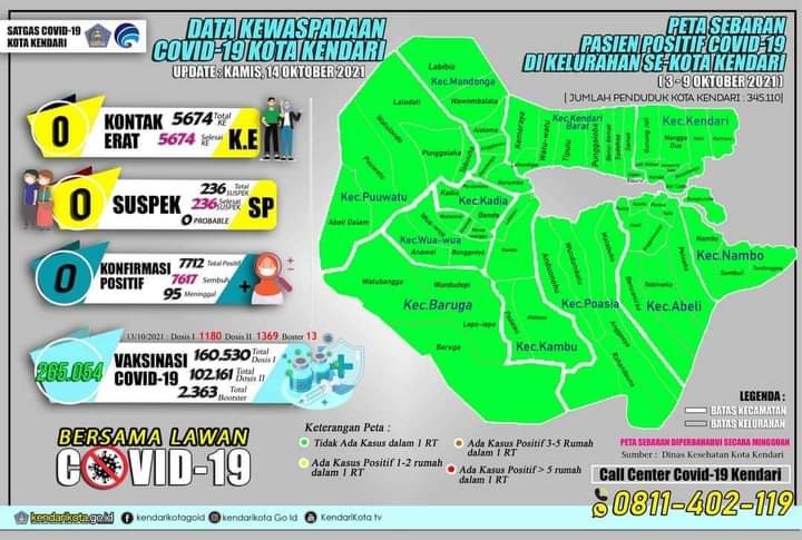 Kendari – Kota Kendari, Sulawesi Tenggara (Sultra) dinyatakan bersih dari kasus Covid-19. Berdasarkan data satuan tugas (satgas) Covid-19 per Kamis (14/10/2021) kemarin, sudah tidak ada pasien yang terkonfirmasi positif atau nol kasus.